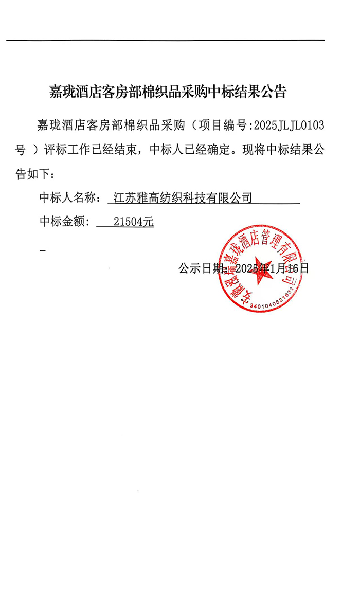 嘉瓏酒店客房部棉織品采購中標(biāo)結(jié)果公告