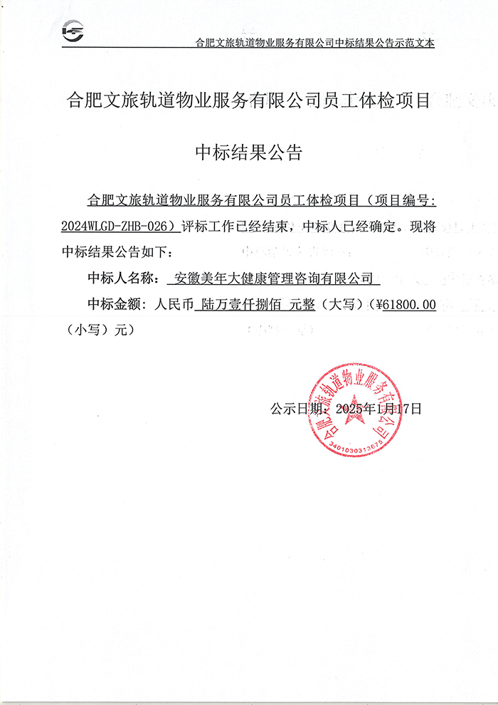 合肥文旅軌道物業(yè)服務(wù)有限公司員工體檢項(xiàng)目中標(biāo)結(jié)果公告