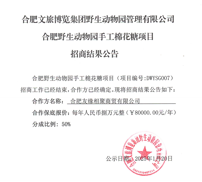 合肥文旅博覽集團野生動物園管理有限公司合肥野生動物園手工棉花糖項目招商結果公告