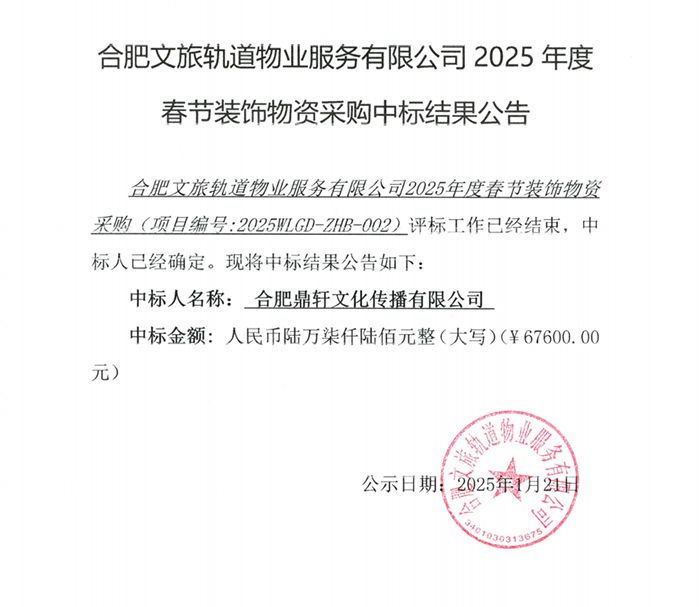 合肥文旅軌道物業(yè)服務(wù)有限公司 2025 年度春節(jié)裝飾物資采購中標(biāo)結(jié)果公告