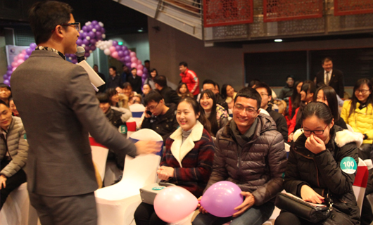 下午14:00,活動(dòng)正式開(kāi)始,全體互動(dòng)游戲擊鼓傳花把場(chǎng)內(nèi)氣氛推向一個(gè)小高潮。一共3輪的擊鼓傳花不僅帶動(dòng)了現(xiàn)場(chǎng)氣氛,也讓數(shù)位嘉賓上臺(tái)進(jìn)行了自我介紹,表演了才藝,引來(lái)陣陣掌聲和歡笑。經(jīng)過(guò)數(shù)輪熱身活動(dòng)后,開(kāi)始主題活動(dòng)“五覺(jué)體驗(yàn)”。10對(duì)男女嘉賓上臺(tái),經(jīng)過(guò)“嗅覺(jué)”選取心儀對(duì)象,通過(guò)“觸覺(jué)”一起走過(guò)障礙物,再由“味覺(jué)”互喂糖果,“視覺(jué)”畫(huà)出彼此心目中的男神女神,最后由“聽(tīng)覺(jué)”去深入了解。讓一對(duì)對(duì)俊男靚女從陌生走向熟悉,活動(dòng)中穿插的互動(dòng)游戲“踩氣球”與“五覺(jué)體驗(yàn)”一起把活動(dòng)推向了最高潮。在“視覺(jué)”過(guò)程中,主持人挑選12對(duì)嘉賓上臺(tái)進(jìn)行對(duì)戰(zhàn),兩人一組并在腿上綁上氣球,場(chǎng)面熱烈,笑聲掌聲不斷。16:30,活動(dòng)在抱抱團(tuán)的全場(chǎng)互動(dòng)及幸運(yùn)大抽獎(jiǎng)的現(xiàn)場(chǎng)表白中圓滿(mǎn)結(jié)束。