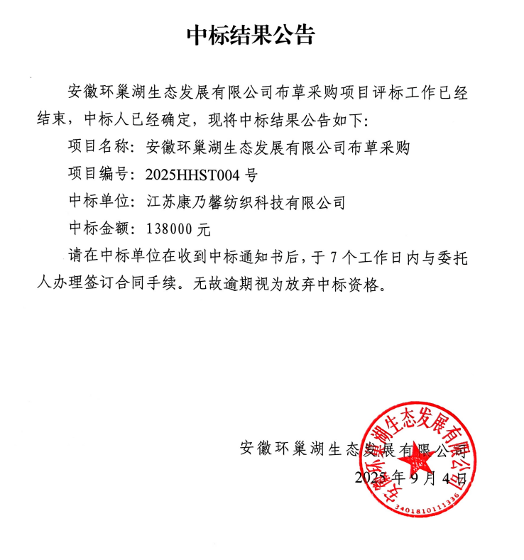 安徽環(huán)巢湖生態(tài)發(fā)展有限公司布草采購