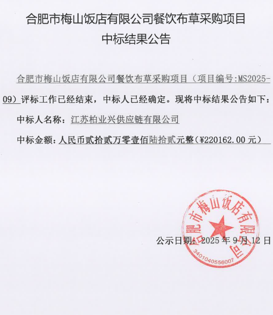 合肥市梅山飯店有限公司餐飲布草采購項目中標結果公告