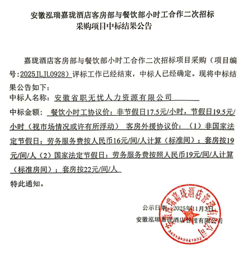 安徽泓瑞嘉瓏酒店客房部與餐飲部小時工合作二次招標(biāo)采購項目中標(biāo)結(jié)果公告