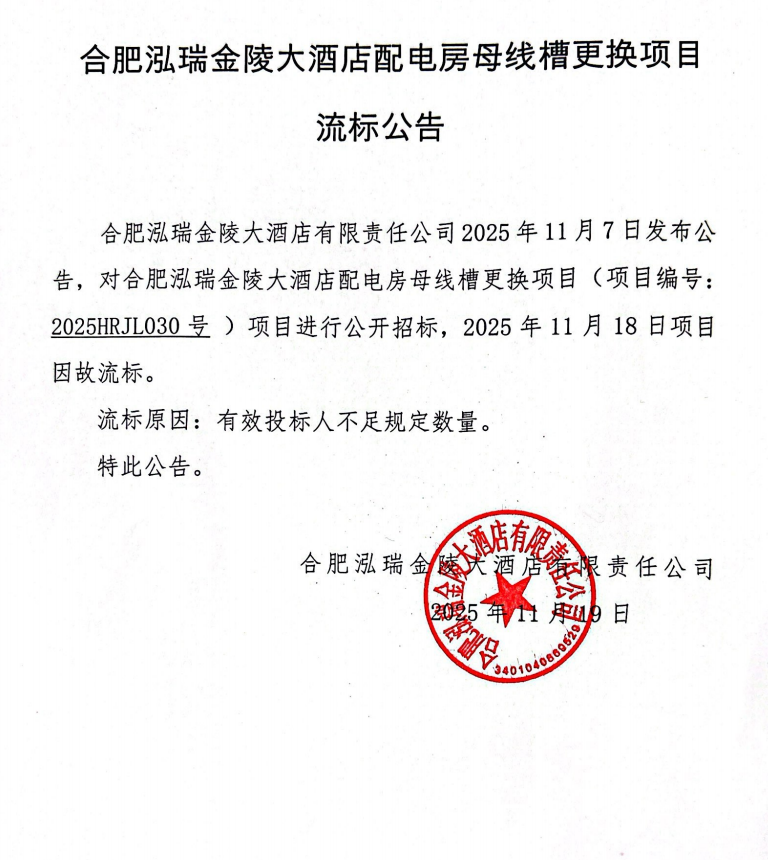 合肥泓瑞金陵大酒店配電房母線槽更換項目流標(biāo)公告