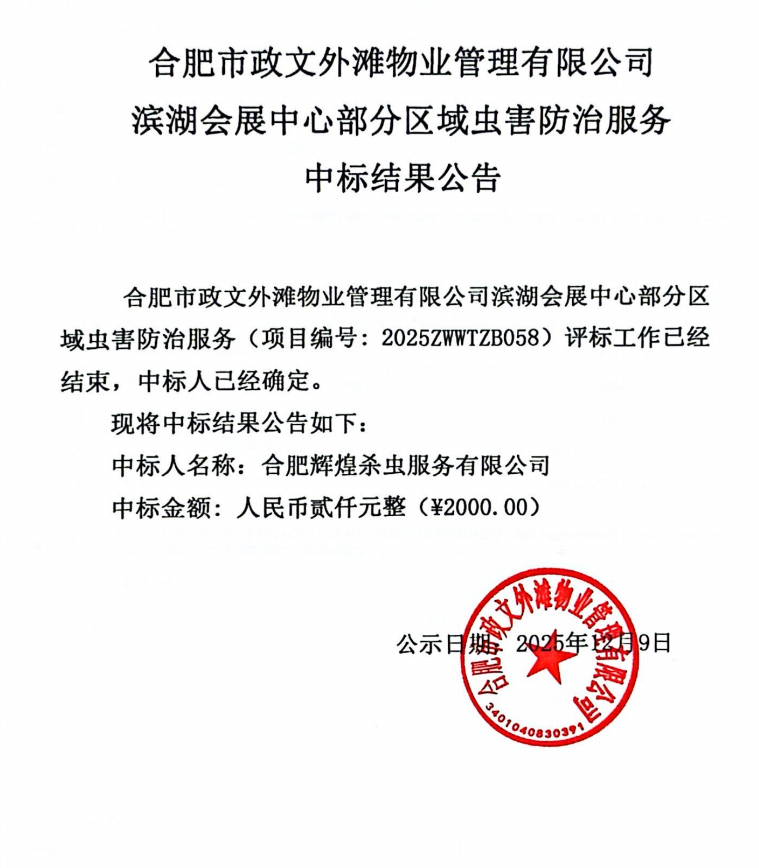 合肥市政文外灘物業(yè)管理有限公司濱湖會展中心部分區(qū)域蟲害防治服務(wù)中標(biāo)結(jié)果公告