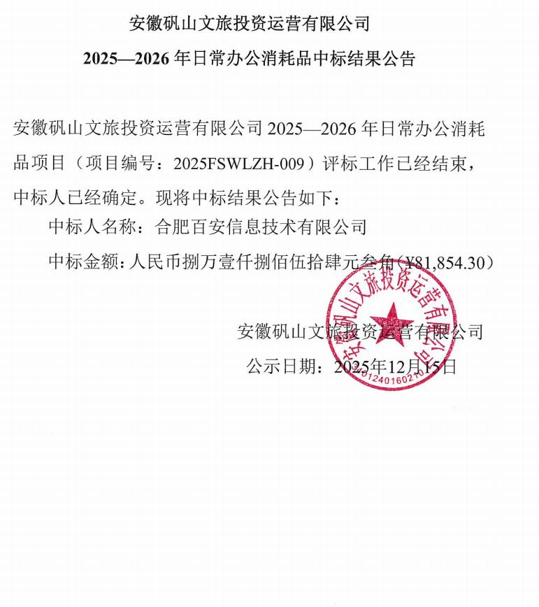 安徽礬山文旅投資運(yùn)營有限公司2025-2026年日常辦公消耗品中標(biāo)結(jié)果公告