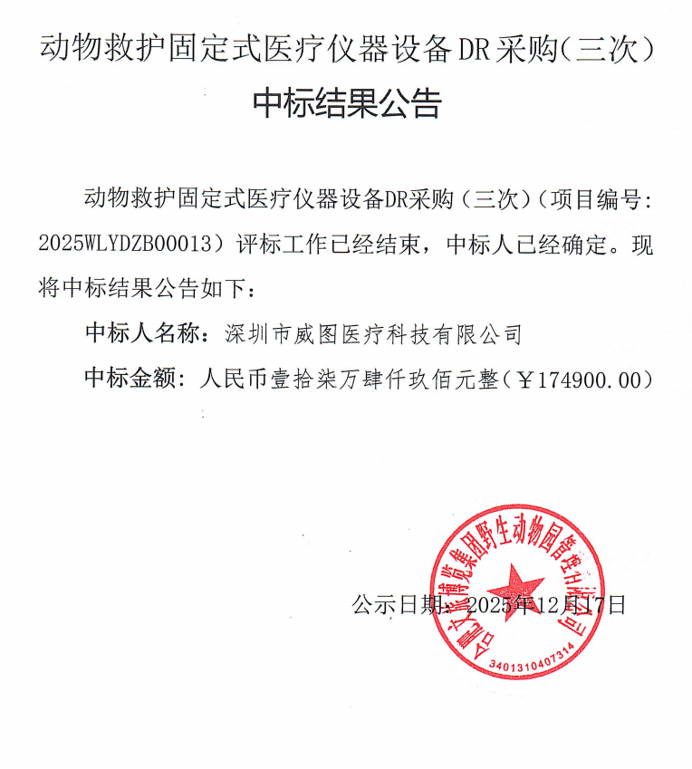 動(dòng)物救護(hù)固定式醫(yī)療儀器設(shè)備DR采購(三次)中標(biāo)結(jié)果公告